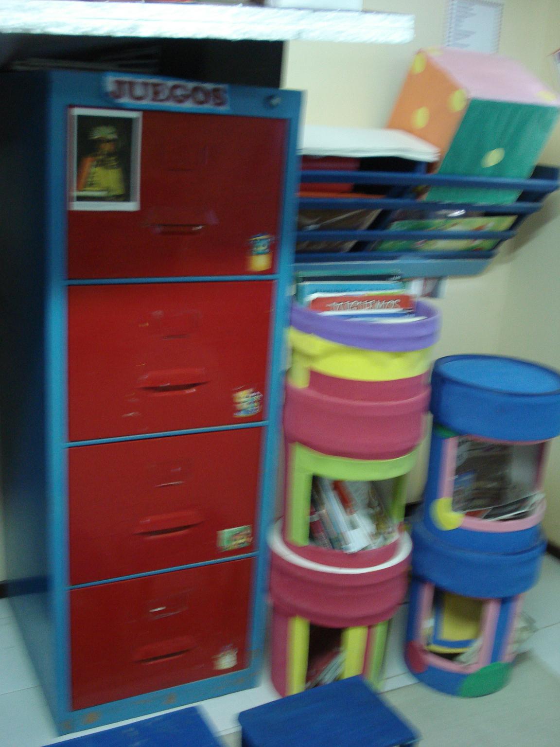 La biblioteca está dividida en dos espacios: rincón literario para alumnos y para docentes, personal de maestranza y comunidad en general. Armarios y estantes para materiales.
